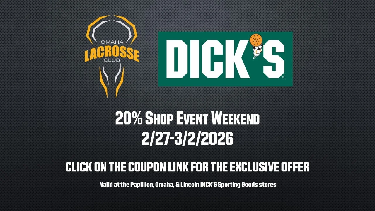 DICK’S Sporting Goods will be hosting a 20% off shop event for all Omaha Lacrosse Club athletes, coaches, and families at the Lincoln, Omaha, & Papillion stores on 2/27-3/2/2026.